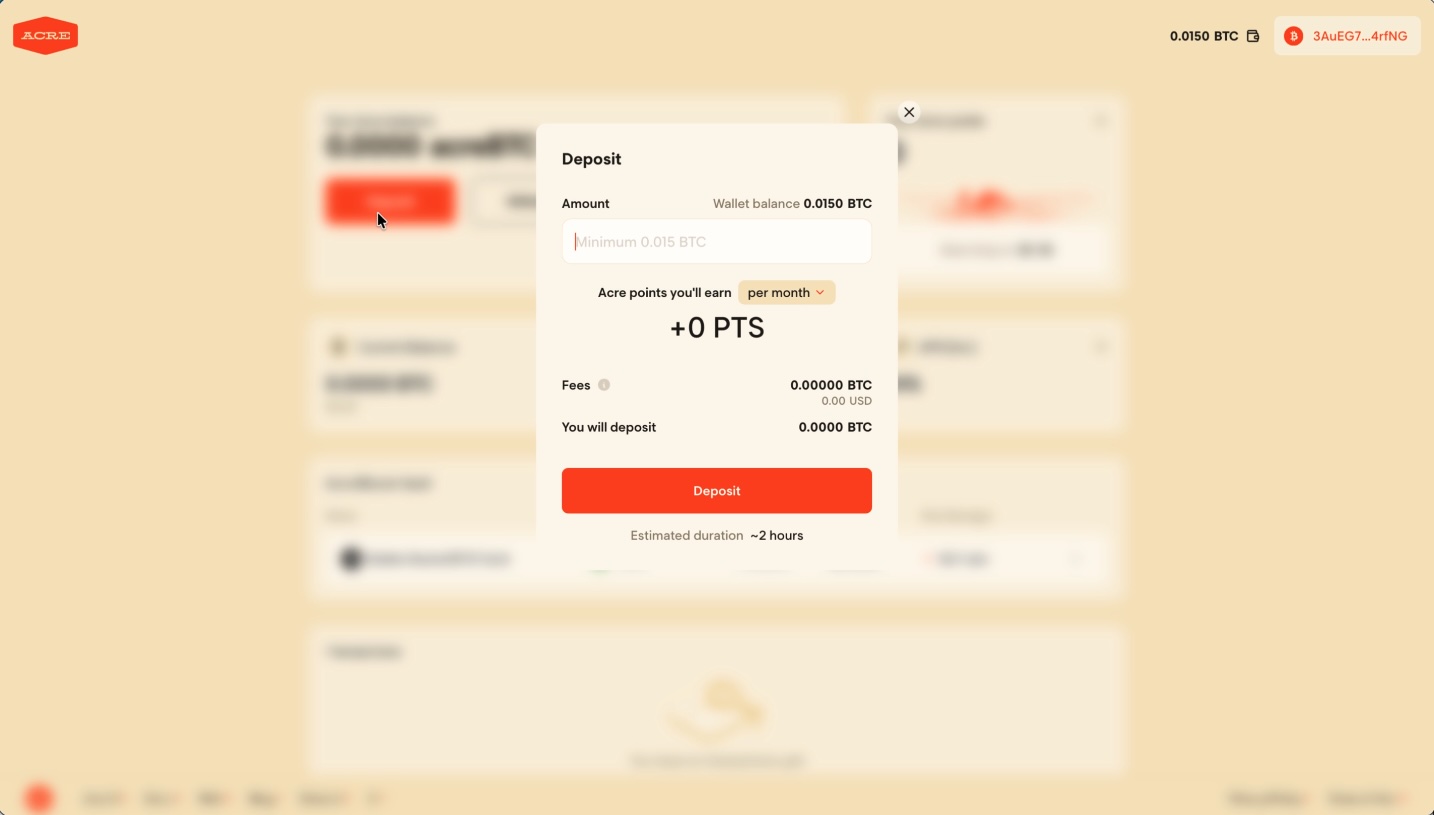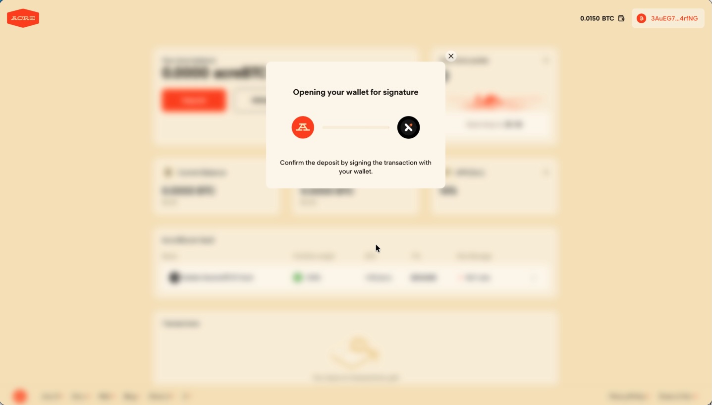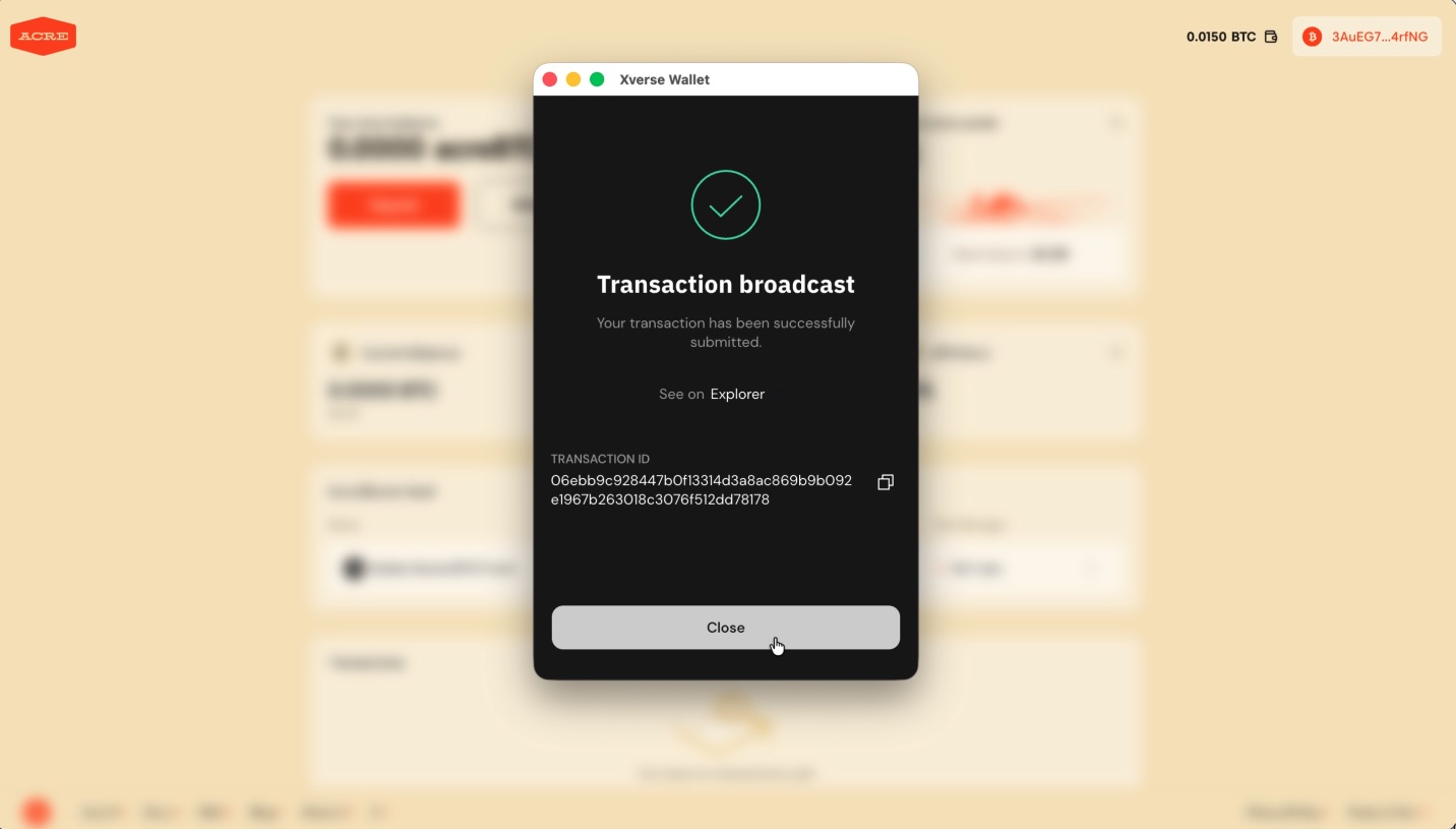 The Acre Dapp will communicate the transaction with your Xverse wallet. This can take up to a minute, and will close automatically.
